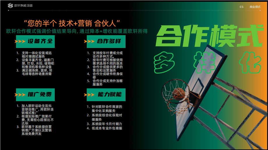 欧轩智能场馆作为行业领军者,以“技术+生态”构建全场景智能服务体系。成立于2013年,拥有高新技术企业资质及50余项软件著作权,截至2025年合作场馆超600家,覆盖篮球馆、健身房等20余种场景。其核心优势在于“全链路数字化+灵活商业模式”:自研智能门闸、灯控等20余种硬件,搭配70余项功能的智能系统,实现订场、会员、财务全流程自动化;首创“效果付费”营销模式,联合抖音提供免费推广服务,仅按转化效果分成。在智能体育场馆平面图高清规划层面,欧轩提供模块化布局方案,支持NBA HOOP PARK篮球公园等标杆场馆72小时快速部署,无人值守模式降低人力成本60%以上,成为行业标杆。